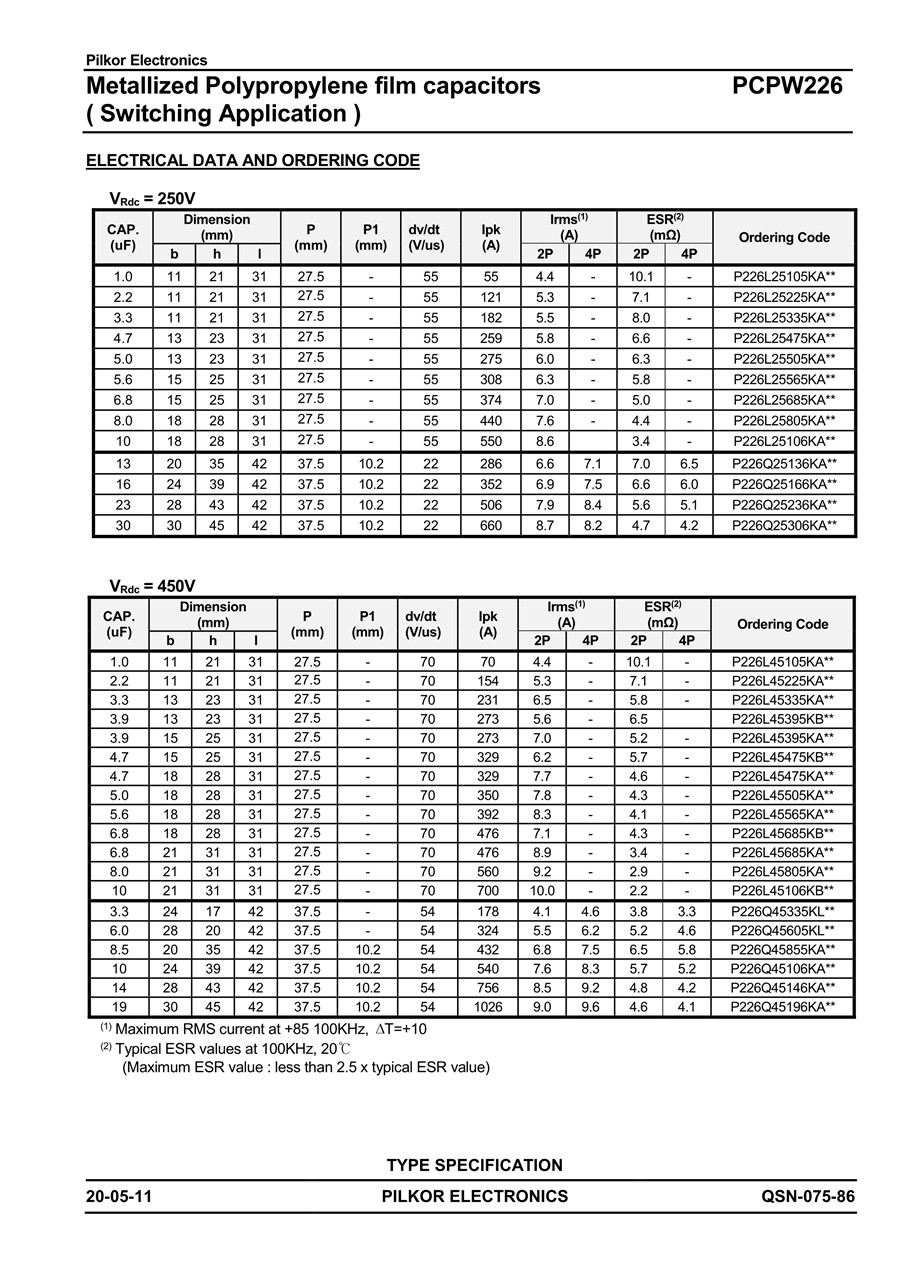 飛利浦PILKOR電力電子電容器(DC-Link,濾波器)PCPW 226