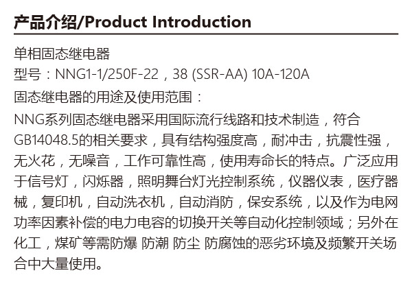 應(yīng)用領(lǐng)域:NNG系列固態(tài)繼電器采用國際流行線路和技術(shù)制造,符合 GB14048.5的相關(guān)要求,具有結(jié)構(gòu)強(qiáng)度高,耐沖擊,抗震性強(qiáng),無火花,無噪音,工作可靠性高,使用壽命長(zhǎng)的特點(diǎn)。廣泛應(yīng)用于信號(hào)燈,閃爍器,照明舞臺(tái)燈光控制系統(tǒng),儀器儀表,醫(yī)療器械,復(fù)印機(jī),自動(dòng)洗衣機(jī),自動(dòng)消防,保安系統(tǒng),以及作為電網(wǎng)功率因素補(bǔ)償?shù)碾娏﹄娙莸那袚Q開關(guān)等自動(dòng)化控制領(lǐng)域;另外在化工,煤礦等需防爆防潮防塵防腐蝕的惡劣環(huán)境及頻繁開關(guān)場(chǎng)合中大量使用。