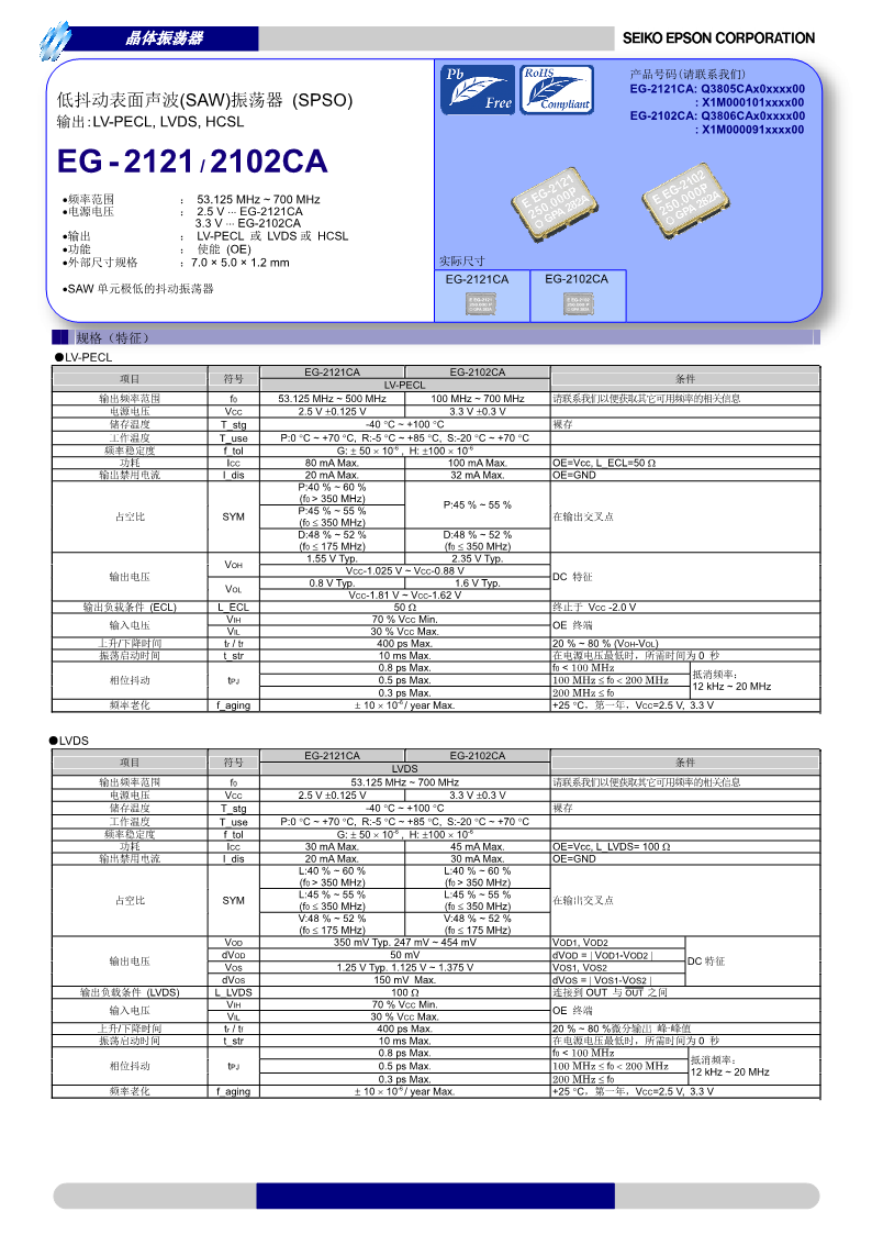 愛普生EPSON 晶振晶體振蕩器(SPXO)表面聲波(SAW)振蕩器EG-2121CA