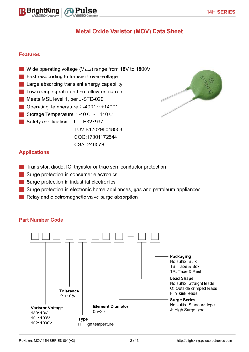 君耀BrightKing壓敏電阻 插件壓敏電阻14H 系列162KH14 162KH14J