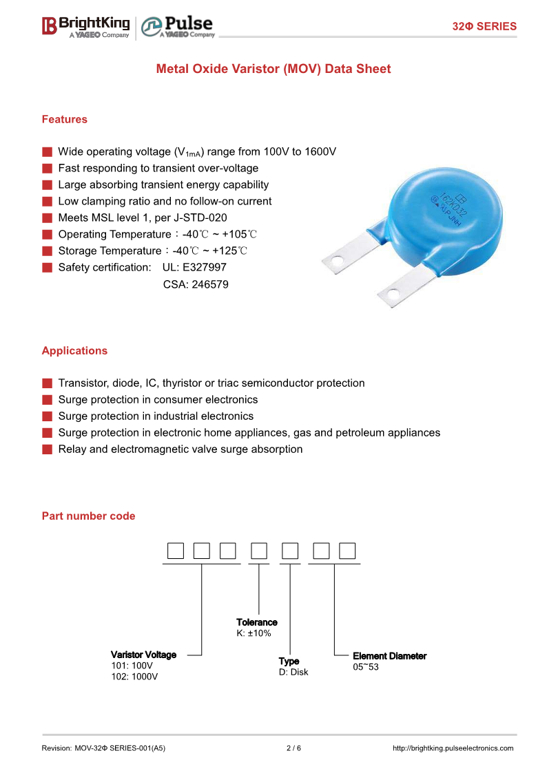 壓敏電阻君耀BrightKing壓敏電阻焊片壓敏電阻32D系列162KD32